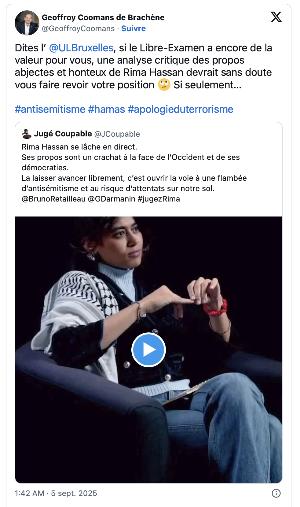 ? À l’ULB , berceau du Libre-Examen, ces propos devraient susciter une analyse critique et sans concession. Si le Libre-Examen a encore une valeur, il doit être mis en pratique face à ce type de dérive.