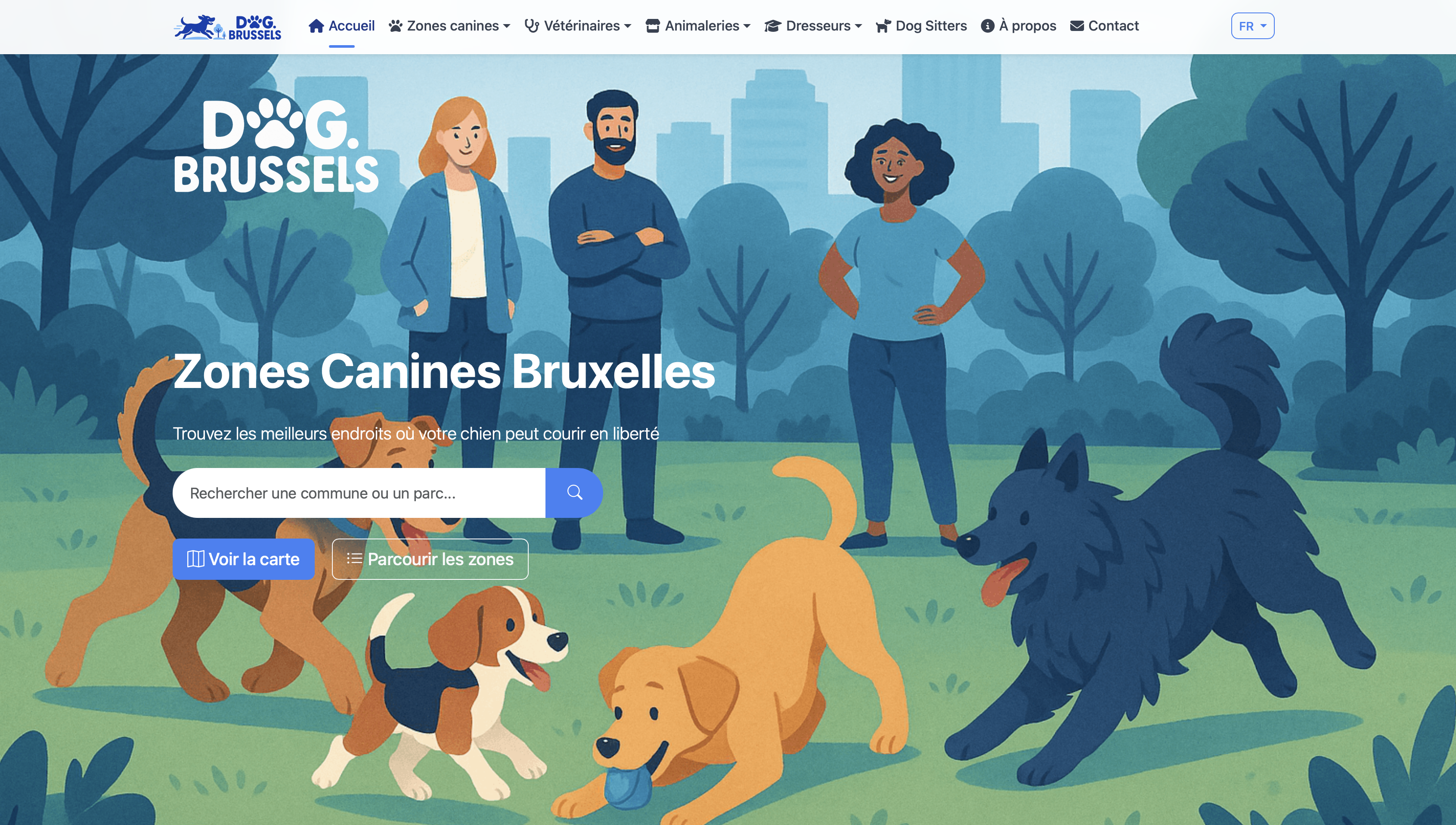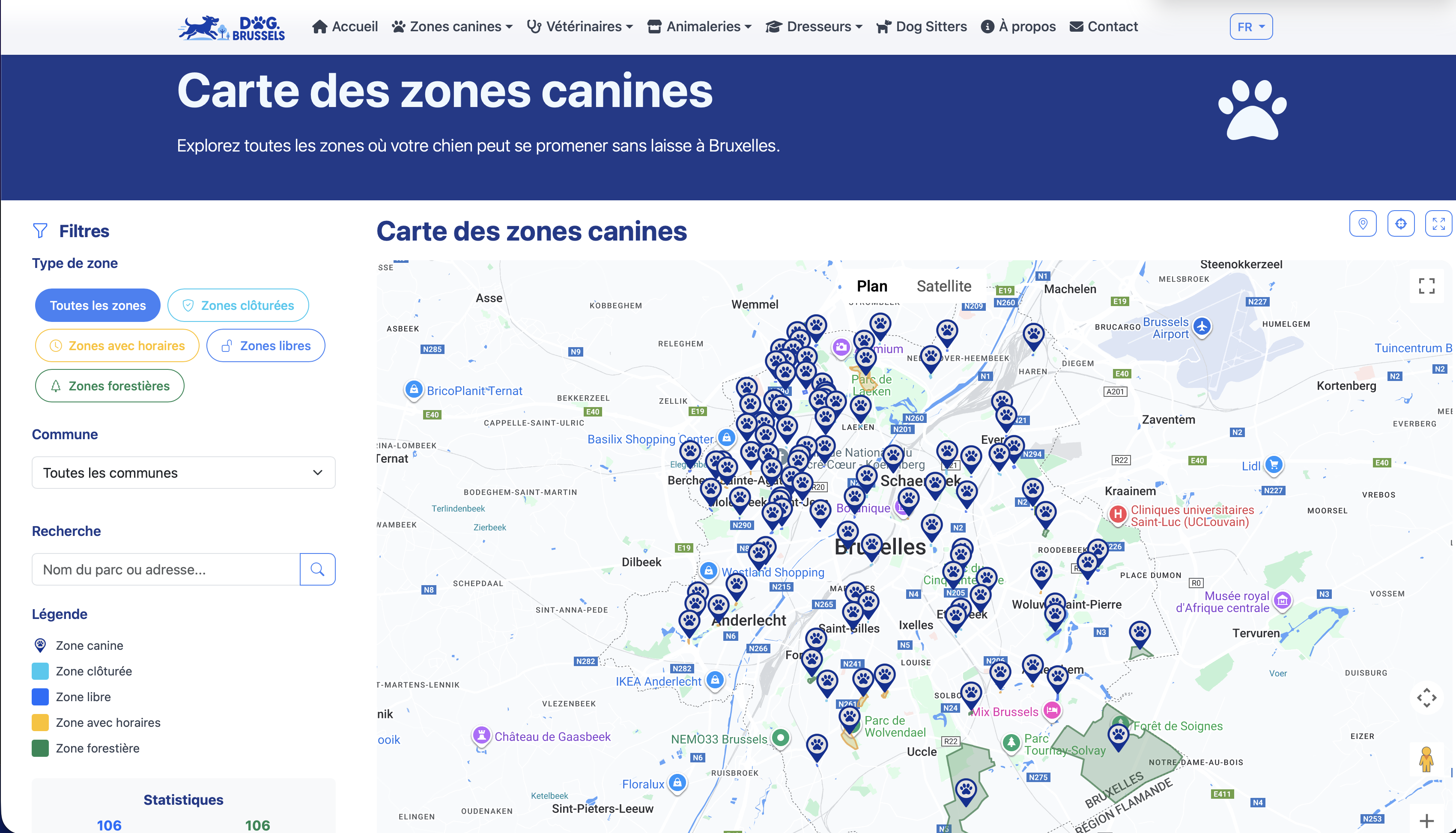 Face à ce constat, nous avons créé le site Dog.Brussels — une plateforme citoyenne destinée à mieux informer les Bruxellois sur les zones canines existantes, leur localisation, leurs horaires et les règles qui s’y appliquent.